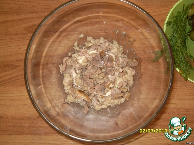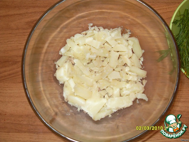 Печень трески открыть, слить масло, выложить в салатник, и размять вилкой. Это будет 1 слой нашего салатика.