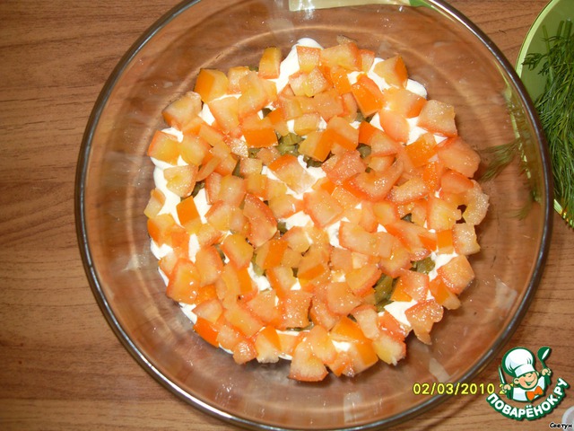 Почистить яйца, порезать кубиками ивыложить на помидор, это будет 5 слой салатика.