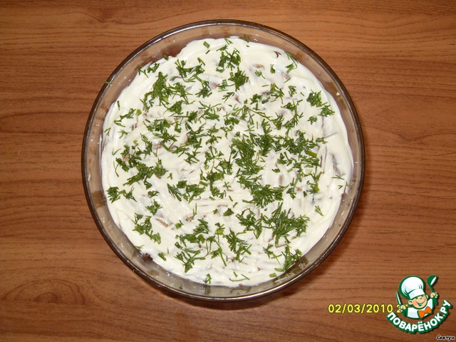 Сверху грибов с луком салат обмазать майонезом и посыпать зеленью.