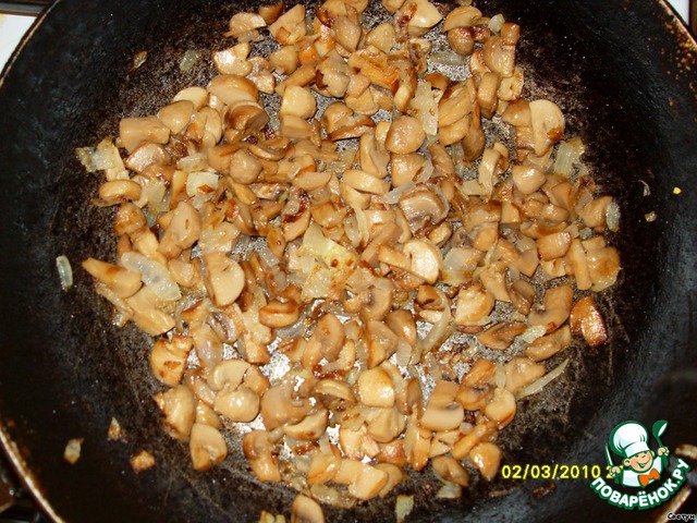Я при обжаривании грибов использовала всего 1 столовую ложку масла, и получилось, что лук и грибы жарились почти на сухой сковородке, это для того, чтобы не сливать потом масло, так удобнее. -