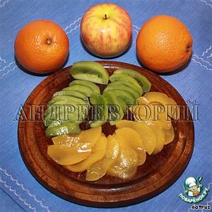 Киви очистить и тонко нарезать. Персики вынуть из сиропа и тоже тонко нарезать.
