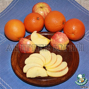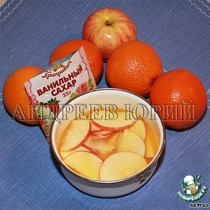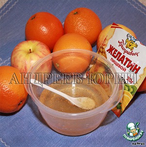 Желатин залить сиропом от персиков и тем, что осталось от варки нарезки из яблок (соком апельсинов с ванильным сахаром), оставить набухать.