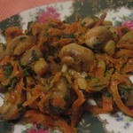 Очень крупную морковь, или две средние, измельчаем на крупной тёрке и добавляем к грибам