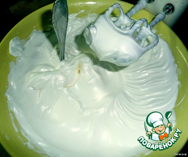 Взбить белки с сахаром в крепкую пену (постепенно, маленькими порциями всыпая сахар), до полного растворения сахара.