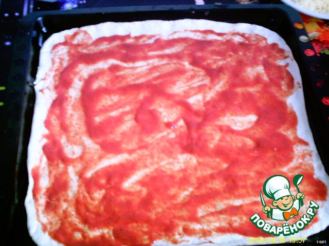 Замесить тесто. Дать подойти. Смазать противень маслом. Готовое тесто раскатать и выложить на противень. Томатную пасту развести водой до состояния густой сметаны, посолить, поперчить и смазать им тесто.