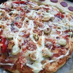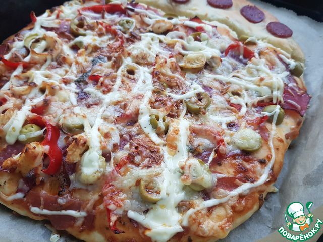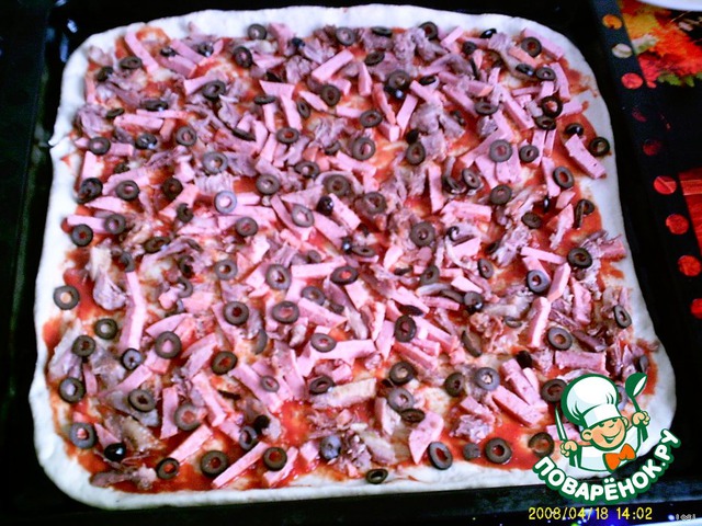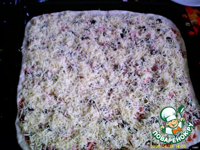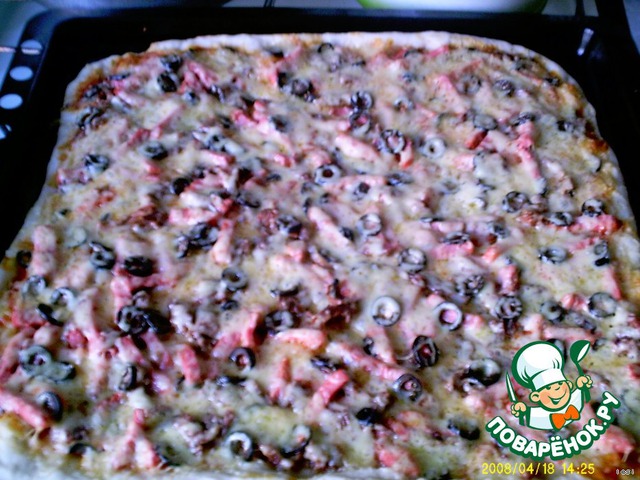 Полученную пиццу поставить в горячую духовку и выпекать 15-20 минут. Готовую пиццу можно подавать к столу.