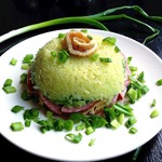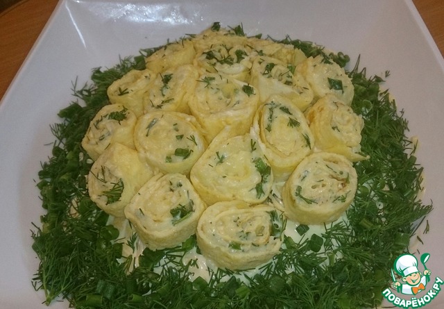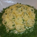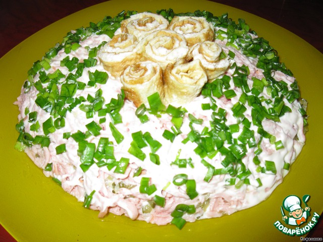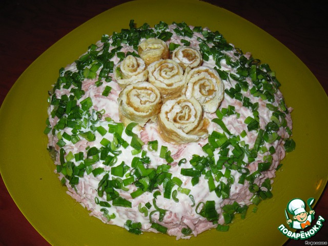Вернемся к остывшим яичным блинчикам. Я нарезала их на полосочки и свернула в мини-рулетики. Конечно, их должно было получиться больше. Но пока я выкладывала слои салата, на кухню шастал сынуля Ванечка, и не просто шастал, а потихоньку "приговаривал" блинчики. :-D Так что пришлось из того, что осталось, выложить цветочек на верхушке салата. И все - больше ни на что не хватило! Вы же можете сделать таких рулетиков побольше и украсить на свой вкус. Или просто порезать блинчики лапшой и уложить ее в очередной слой.