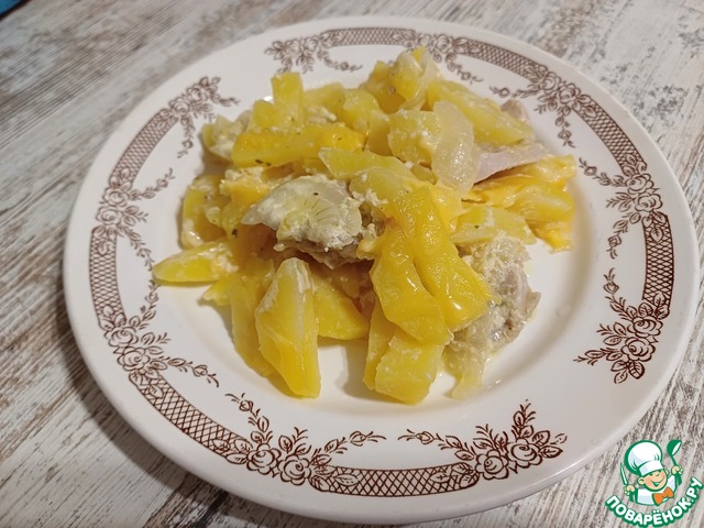 Рецепт прост в приготовлении. Основные ингредиенты: мясо свинина, картошечка, майонез и лучок. Получается очень вкусно. Мужчины в восторге :) Девушки, не судите строго, это мой первый рецепт.