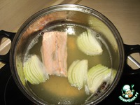 Разделать рыбу на филе. Сварить прозрачный бульон из хвоста, добавив крупно нарезанный лук, горошины перца.