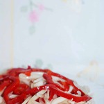 Перчик тоже почти прозрачными ломтиками.