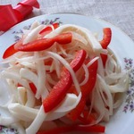 Остывшие кальмарчики режем соломкой очень тонко.