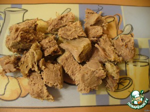 • Готовое мясо вынуть из кастрюли, остудить. Нарезать небольшими кусочками.