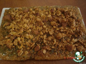 Первый корж промазать джемом, вареньем, что есть под рукой, сверху присыпала обрезками от торта, я их тоже испекла (было жалко выбрасывать), потом опять промазала и положила 2-й корж.