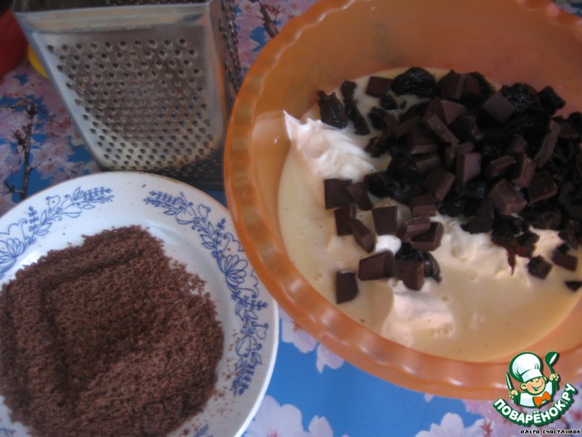 Сметану смешиваем со сгущенным молоком, черносливом и половинкой шоколадки, поломанной на кусочки. Вторую половинку шоколадки натираем на мелкой терке.