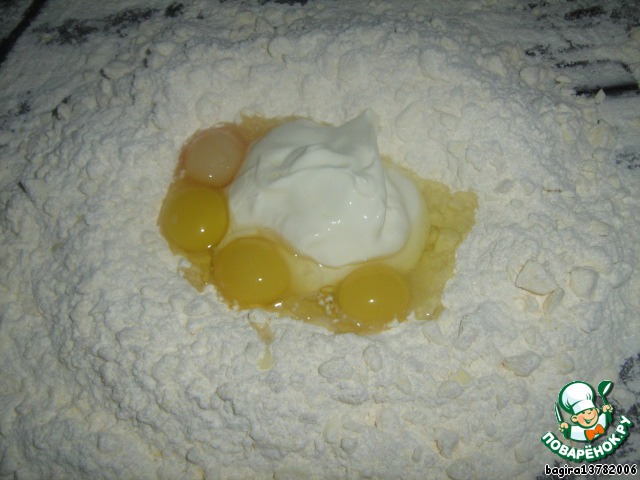 Затем добавим сметану и яйца и быстро замесим тесто.