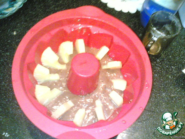 Ананасы отделить от сока и кружочки порезать пополам. Вставить в тесто ребром каждый полукруг ананаса, в соответствии с выемками в формочке.