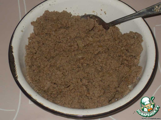 Обжаренный фарш пропустить через мясорубку или измельчить блендером. Добавить соль и перец (я добавила специи для мясного фарша).