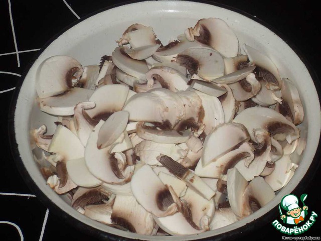 Шампиньоны очистить и нарезать тонкими ломтиками. Вторую луковицу нарезать очень мелко, обжарить до золотистого цвета, добавить нарезанные шампиньоны и обжарить все вместе, посолить и поперчить. Этот шаг я не сняла, торопилась к приходу мужа.