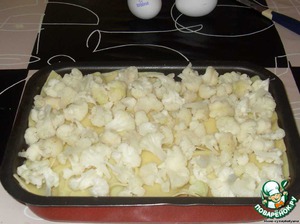 Цветную капусту отварить в подсоленном кипятке в течение 5 минут, охладить и разделить на маленькие соцветия. Выложить поверх третьего слоя макаронных изделий.