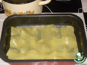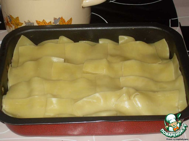 Далее выложить еще 1/3 макаронных изделий (в моем случае снова пластины теста внахлест).