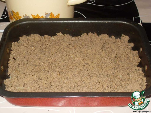 Поверх макаронных изделий выложить мясной фарш и разровнять его.