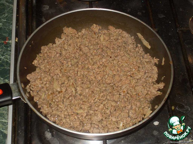 Одну луковицу измельчить и вместе с фаршем обжарить на растительном масле.
