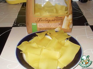 Макаронные изделия засыпать в кипящую подсоленную воду (на 500 г - 5 л воды), отварить до полуготовности, откинуть на дуршлаг и хорошо промыть кипящей (!) водой. Разделить макароны на 3 части. 1/3 выложить в форму. Поскольку у меня были этакие пластины, я выложила их внахлест.