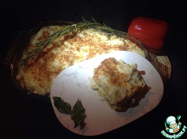 Готовую запеканку вынуть, накрыть салфеткой и дать ей постоять минут 5. При подаче посыпать зеленью. Я хотела приготовить соус, чтобы полить запеканку - почти лазанью, но муж категорически отказался. Сказал, что соус все испортит.