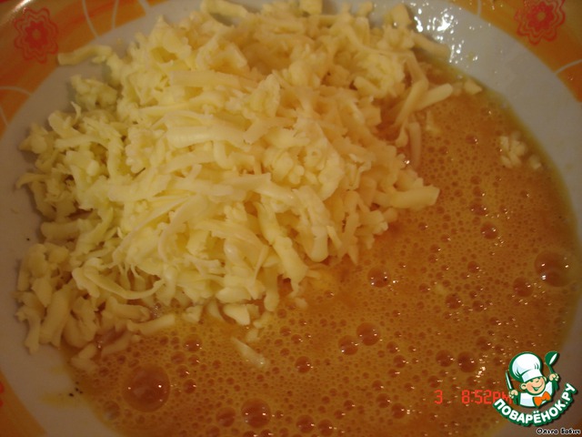 4 яйца взбить, добавить соль, перец, чеснок + 150 тертого сыра.
