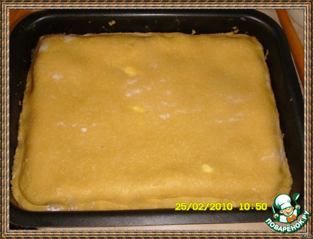 Духовку разогреть 180°C. Форму смазать жиром или застелить бумагой. На дно выложить одну часть теста, запечь в духовке, приблизительно, 10 минут.