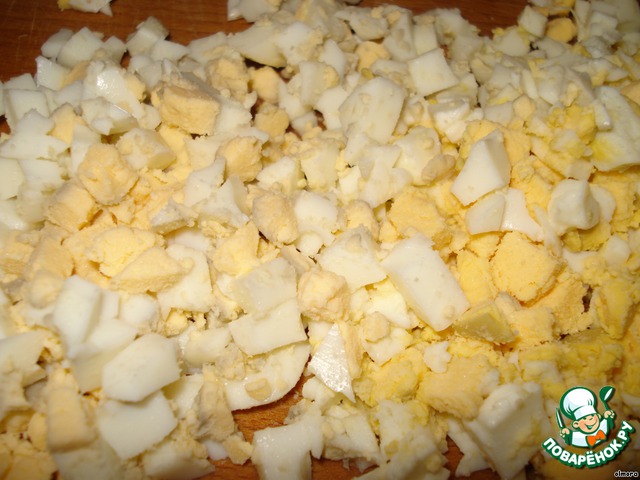 • Заранее отваренные куриные яйца нарезать средними кубиками и добавить в форшмак.