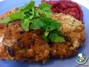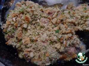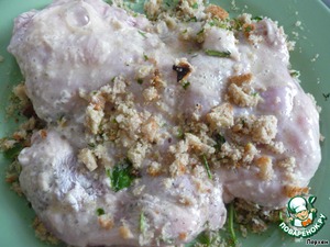 Окорочка освободить от кожи и костей, посолить, поперчить, дать постоять минут 15. Хлеб вместе с зеленью измельчить в крошку.