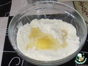 Муку просеять вместе с разрыхлителем. Добавить маргарин, разрезанный на кусочки, руками растереть в однородную крошку. Яйцо взбить с 2 ст. л. воды и щепоткой соли и влить в муку. Замесить тесто.