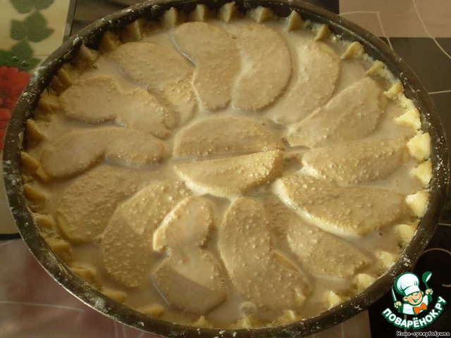 Самые красивые и ровные ломтики отложить. Остальные выложить на тесто, полить несколькими ложками заливки. Сверху выложить красивые ломтики и залить остатками заливки.