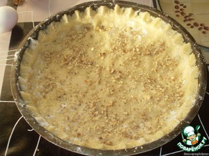 Форму смазать маргарином. Тесто размять в форме, оформив высокий бортик. Многократно наколоть вилкой. Посыпать измельченными орехами.