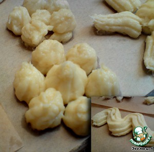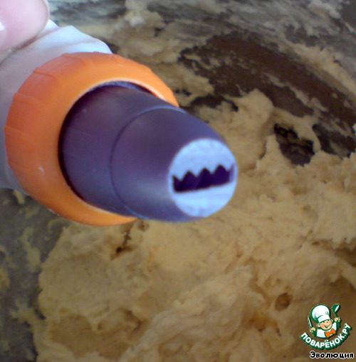 Тесто перекладываем в кондитерский мешок, и через рифленую насадку отсаживаем на противень печенье.