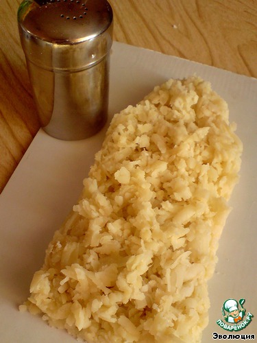 Вареный картофель натираем на крупной терке. Укладываем на блюдо. В данном случае придаем форму погона.:-) Разравниваем. Чуть солим.