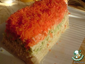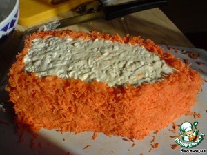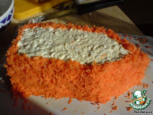 Морковь – на мелкой терке. Оставляем примерно половину для украшения, остальную выкладываем.