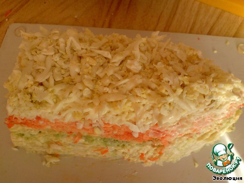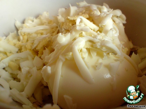 Вареные яйца идут следующим слоем. Трем их на крупной терке.