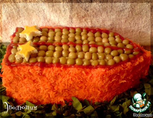 Не помню у кого, но есть такая песня. Сам салатик совсем не сложный, не затратный, но от этого не становится менее вкусным. Вы можете менять количество и размер звезд на погонах. У меня же – лейтенант))) Готовила перед 23 февраля, но загрузить получается только сейчас. Рецепт из стаааарого журнала «Люблю готовить».