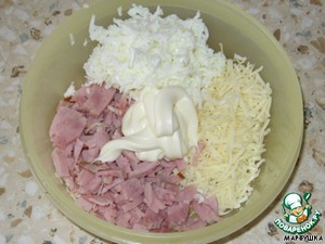 Режем ветчину, натираем сыр. У яйца трем только белок.