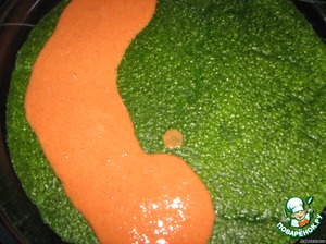 Пока готовился шпинатный слой, вы успеваете взбить ещё два яйца, 1 ст.л майонеза, 1 ст.л томатной пасты и перец с паприкой для второго слоя. Все слои я взбивала в блендере. Сверху на шпинатный слой вылить слой с томатной пастой и поставить в духовку на 7-10 минут при 180 гр. Вынуть, дать слегка остыть.