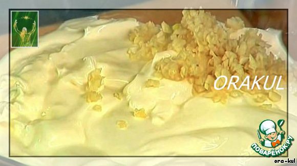 в крем-фреш (вполне можно заменить густой сметаной, но желательно добавить немного сливочного сыра) добавим натертый на терке чеснок -