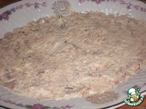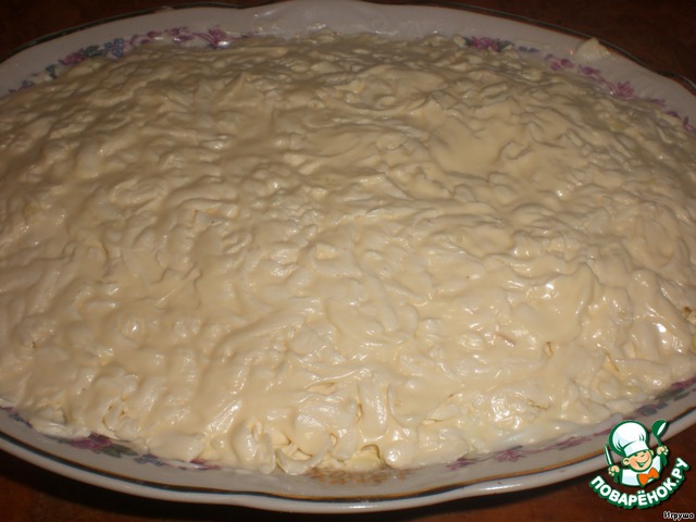 Выкладываем на яичный слой и смазываем майонезом.