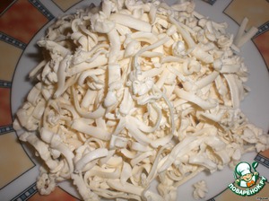 Снимем кожу, освободим мясо от костей и разделим руками на волокна как можно мельче. -