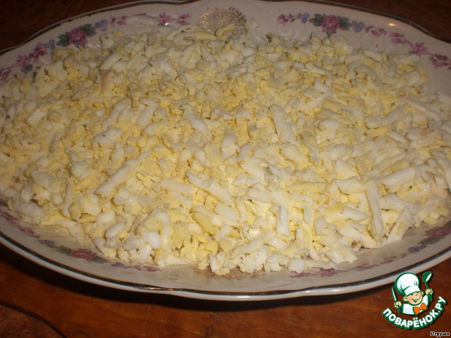 Для третьего слоя варёные яйца натрём на крупной тёрке и выложим на орехи. Этот слой тоже смазываем майонезом.