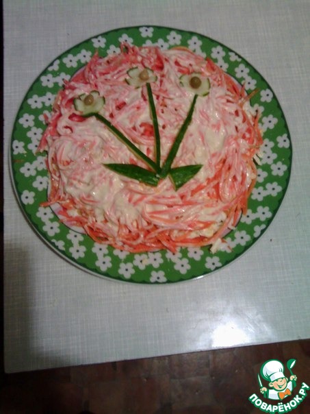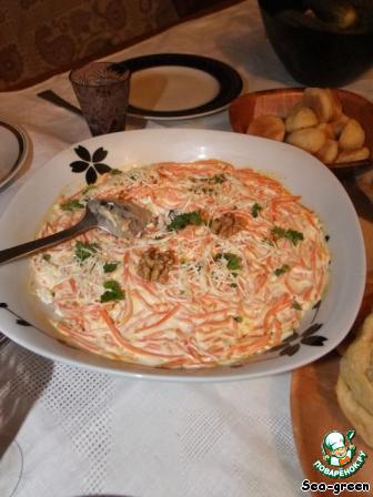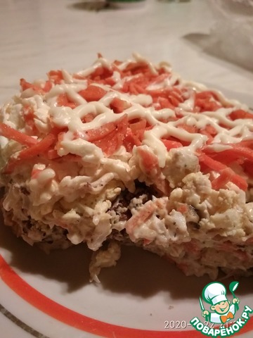 Нашла рецепт ещe одного слоeного салатика! Сразу же приготовила. Получилось очччень вкусно! Поэтому спешу с Вами поделиться, дорогие поварята. Сочная курочка, хрустящие орешки, сырок, остренькая морковка... Приготовьте этот салат к празднику!