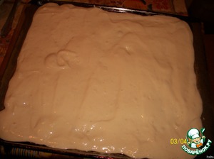 • Подготовить противень. Застелить пергамент и смазать растительным маслом. Тесто вылить на противень и максимально разровнять.