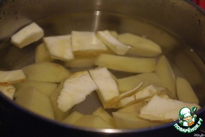 Картофель чистим, моем, нарезаем на ломтики. Сельдерей также, только ломтики поменьше. Заливаем водой, на два пальца выше овощей.