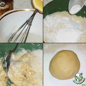 Взбила венчиком белок и добавила несколько капель лимонного сока и коньяка. Перемешала сахарную пудру с миндалем и добавила белок с лимонным соком и коньяком. Замесила сладкое тесто.